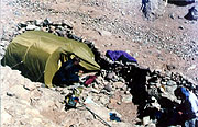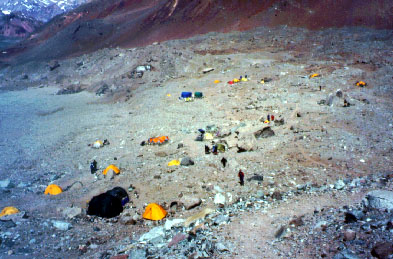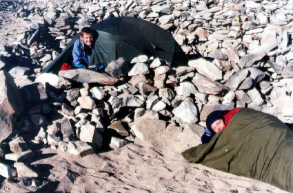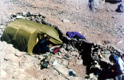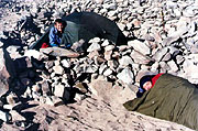 There are about 4 other teams in base camp. Two Mexicans who we met on the way, 2 blokes from Leeds, 3 Italians and an American guy with an Argentinean guide. Until now, noone has made the summit from the Polish Route, although a few parties have tried. There is plenty of nice tent sites and we find a suitable spot for putting up both our tents. There is running water in a stream close to camp.