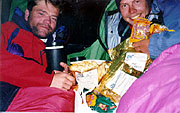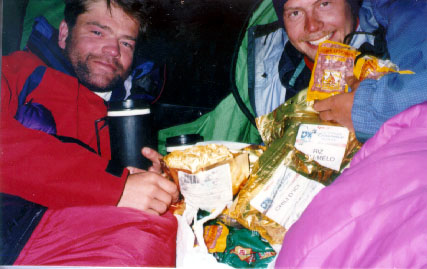 On the way down we notice another tent, which turns out to be Jay and Nico (the American and Argentinean). They invite us in (their tent large enough for five!!) and share their Christmas cake with us. Very nice of them and very good fun. We want to go for the summit the next day, but the wind seems to strong. Nico thinks it is out of the question in the current condition, and he should know being the only local on the mountain. The rest of the day we spend in agony trying to make a decision of what to do. We do not want to wait for days in our little green tent barely big enough for all of us (we are starting to change the old Norwegean's mantra to: "The Green is The Killer!"). We also calculate our remaining days and it turns out that we have to start descending the 28th at the latest, allowing a two extra days to arrange mules back from base camp.