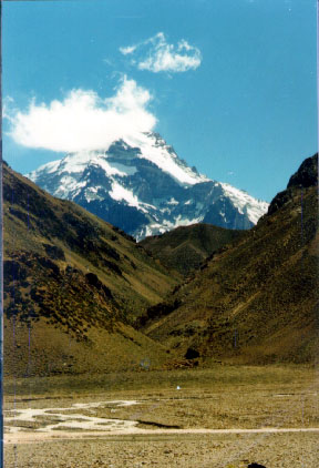 The hike is long, gentle, going up a valley full of rock. It is very hot and some head protection from the sun is necessary to avoid instant toasting. We see Casa Piedre sooner than expected, and notice the Racones valley cutting in on the left (West). Then an amazing sight- Aconcagua is visible for the first time in the distance! It is extremely beautiful, with a tiny cloud blowing on top. The Polish glacier is clearly visible, and we study it intensely through the binoculars. It look very steep from this angle, and it has an intimidating drop off just below it. Not a good place for slipping. The south face is also visible from here - very serious stuff. We are very happy to finally see what we've seen on numerous pictures, but it looks so much better for real.