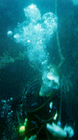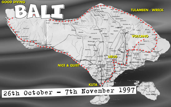 Next morning we split with the rest of the Willerups (mum, dad and sis) and headed out to the XXX wreck at Tulamben with master Henry. We arrive to this pretty popular place and we need to get the deep dive and the wreck dive done to get our Advanced certificate, Yooor. We start of with the deep dive. Loads of others divers on the beach - in particular a pretty extreme looking babe strolls around amongst the divers and before we know it Henry is chatting her up forgetting all about his two innocent students (us!). Anyway - we eventually head into the water and start our descent into the abyss. We follow the huge wreck on our way down and we stop when we reach 35 meters. Everybody gives the okay signal and Henry hands out some small scribble plates where we have to solve a few mathematical puzzles - to check if we are affected by the Nitrogen Narcosis. We both seem okay and after 10 minutes or so on 35 meters we start heading upwards.