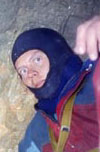 | Photo: Climbing the ladder pitch A short oxbox and a couple of roped pitches down again and we were at the White Passage. I had a hunch (looking at the survey and listening to Martins compass bearing announcement), that the way on was downwards - I could feel the void coming. We headed downwards and joined the obvious "Red River" and we now knew the Time Machine objective was within reach. Probably at the point where Tony White turned back to get his mates we started feeling that there was something big approaching. And wow, was we impressed. The Time Machine is absolutely huge and just goes on for ever. Unreal to think that this sort of chamber can exist underneath the gentle looking Llangotock mountain. The objective was met in record time, we took some photos and the plan was to return to the surface and hopefully establish an honourable in-out time confirming the AHPES as the Association of HP Elite Speleologist. But one of us wanted more. Martin was going further and further and at the end couldn't take it any longer. "Lads, let's go further". A bit of argueing about the original objectives, mostly from me - I always am a bit weary about changing objectives at the goal, I was getting pretty knackered, but actually I really did want to try and get a sub 5 (?) hours for the shear festivity of it. But Martin took a wise decision - he carried on on his own!. Again a good move as further discussion would have got us nowhere and we had no alternative that to follow. Due to commitments in the evening (when do we learn not to make any plans for the evening of a speleotrip) we did decide that our turn around time should be 3'oclock which would keep the timeplan and keep everyone happy. As we headed down the amazing continuation from Time Machine we all was 100% on for the medium. This baby just kept drawing us in. The route to the "bonzai three" (a little pretty formation) was absolutely superb - a streamway passage lavishly decorated and well, just plain and simply superb caving. We were still doing a fair speed and as the clock turned 3pm we were at the Kings Crossroads which probably was about 15 minutes from the end of the possible trip - the terminal sumps. But the decision had been made earlier, and we spend around 30 seconds enjoying being this far in the cave, and now had a long but enjoyable trip out into freedom which was achieved in around 3 hours making a total underground time of 7 hours. Unstone lead the crawl out in incredible speed and after careful assesment from Dr. Beale on the whole trip Unstone was readmitted into the HPCC Elite Speleological Unit. An absolutely superb trip, possible the best sporting trip