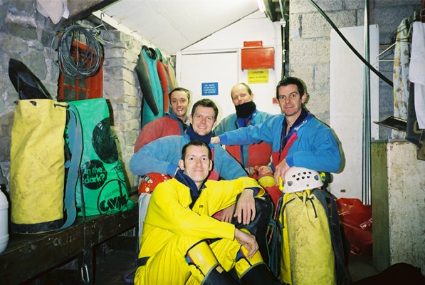 Paul, Mathias, Tim, Martin and Royston in the luxurious changing quarters of the White Hall Hut ©2002 Selftimer