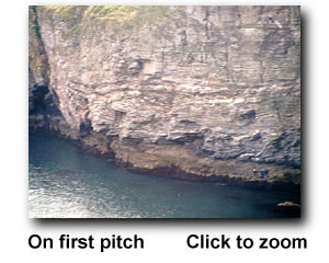 The tide was really low and we were able to uncoil our ropes at a friendly little ledge at sea level. We had one last look at the father and son team. Dad was pulling on gear on the initial traverse of the 'raker. It was evident that they would be some time. Fred wanted to get up in decent time so that we could go to Chudleigh and do some climbing with Theresa.