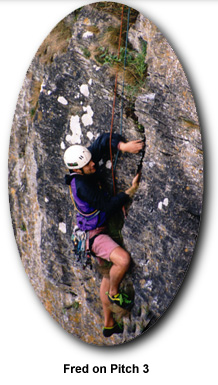 I thought Fred followed the pitch in fine style. He took a while, but I thought that he was faster than I was. There didn't seem to be any strife as he made that daunting pull out of the corner and onto the juggy arete. Before I knew it, we were both at the belay. "I'm pumped stupid", said Fred. I thought he was exaggerating - he looked OK. We swapped gear and Fred prepared for the lead of the next pitch. "A bit of factor 2 avoidance gear would be good up there, Fred", I said (this was in retrospect something of an understatement).