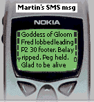 The Moonraker team asked us whether we were alright. I knew we were. As a matter of good style, we had to finish Goddess. I assumed Fred didn't want another go (he really was pumped stupid now and was presumably in something of a nervous state). I led the pitch in nervous style. Wherever there was a piece that Fred was belaying on, I placed an extra piece (just to be sure). I got to the in-situ piece. It was a Peck peg. I clipped it. Just to be sure, I gave it a pull. The peg moved. Oh dear - that peg that we had been dangling from was actually not really attached to the crag at all. "You might as well pull this one out as a souvenir", I said to Fred. I moved to where Fred had lobbed. He was right - the holds were muddy and pretty poor. I gnarled in a friend 1 and then set to work with my nut remover. On excavating the mud, I was able to find a little finger jug. From the finger jug, a nervous move led me into the juggy vegetated crack above. It had been a worrying little lead, but I was at last on easier ground, above the moves that Fred had lobbed from.