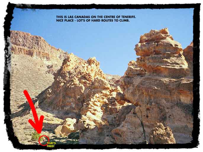 The night was spent camping inside the gorge. Very picturesque, quiet, clear starry night but quite windy. The next day we were woken by early rock bums who had bagged four or five routes by the time we got our act together. We started off on Esponlon del Rampa (6a) which took a couple of attempts. Papeo Chachi (6a) was delicate slab climbing with good resting positions in an adjacent diedre. Super Lopez (6b), a very steep but most enjoyable finger exercise. McNesio (6a), a short overhanging problem which required determination. Corazon de Metal (6a+), continuous with no resting spots - the pace has to be kept up. We left the crag in the afternoon, quite knackered with aching fingers and forearms. The evening was spent in Las Americas, the English colony, for some well-deserved (we thought) partying.