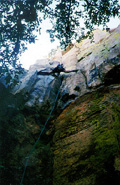 After the climb we touch base with Armando and his two friends and we follow them to the sunny face where Armando is going try a 5.10d and he has a bolted 5.10b in store for the two of us. Hmmm. Well we see the route and this is a face climb, which *should* be at least Mathias' expertise more than anything. The bolts are spacious (four in total) but looks like they are placed exactly where needed. The crux is according to Armando to clip the second bolt and for that reason he suggest climbing with a double rope which we do. Turns out to be a very critical bit of beta. The clip is rather desperate, but all the more rewarding as the sound of the closing carbiner clicks out in the stillness of the gorge. Mathias is leading, unfortunately took a minor wipper on the first bolt, but climbs it clean after that. An absolute must do route if you are in Aculco and are into technical face climbing. Fred follows and rest two times on the rope but finishes up in style. Yoor! We are congratulated by the others and they offer us to try this route that Armando has put up a top rope on. Obviously we are not much for top roping anything, but as a matter of curtisy we accept the offer and hey - we are in Mexico, not in stubborn old Britain. Mathias tries first, hangs once and finishes the route after a very streneous move. Excellent route and jamming test piece, shame I didn't try to lead it. Fred tries it as well, but fails to do the crux move and get lowered down but still get cheered by our three friends. Nice people. The last route we can fit in the afternoon's program is another beautiful line of a splitting crack which supposively is 5.10a. Mathias leads, struggles all the way, especially in the top, and fails to finsish it in pure style as he rests on a friend near the top. A German busdriver looking guy appeared on the top of the crack shouting comments in German to us most of the cilmb, which didn't help much on the concentration, but he disappeared after Fred - as a joke of course - shouted "Denmark to Eideren", but the German maybe thought we ment it seriously and ran away in panic (he was from Slesvig Holstein). Fred seconds the difficult climbs - hangs at the same place but otherwise finished it in fine style. Satisfied with the days activities we head off to the van (parked 10 meters away) to cook supper. (Needless to say we thought it easier to drive into the town and have a nice roasted chicken (26pesos) instead :-). |