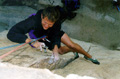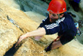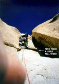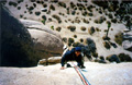 As I put my weight on it the foot suddenly slips and I plummet towards the ground 10 meters of fun climbing gets me to the base of the crack system I'd seen from below. Dammit!, it's a bloody offwidth. I hesitate for a while considering whether I should find an alternative line by traversing left or right. It is certainly nowhere near the route description for "Mike's book", so I wonder what will happen if I start venturing into this unknown territory. It looks like protection might be a problem, the offwidth continues for 10-15 meters before it narrows suddenly to little corner, but it doesn't look like there is a crack in the corner. Above that, the corner disappears and there is nothing but blank rock, but the angle eases considerably up there, so it will probably be possible to climb up on friction alone - just like the top section of The Flake. With the offwidth experience from El Escalon fresh in my mind, I edge up into the crack with considerable doubt. I get a few bits of pro in at the bottom of the crack - a solid #9 nut, a sling around a bollard, another really marginal sling and a camalot 3. That's it, though. About 6 meters futher up is the only other hope of protection - the crack looks just narrow enough for the newly purchased camalot 4. I pause for quite a while, not wanting find myself up there and discovering that the cam won't fit. No chance of retreat up there, only up or a serious fall down. Ok, here we go. The climbing is not that difficult but it's awkward moving up that bloody offwidth. After some not-so-graceful wiggling up the crack, I find that furtunately the camalot seats itself nicely. What a relief! Man, am I glad we bought this extravagant bit of gear in San Diego yesterday for a mere 80 bucks! I would have paid double up here with no other hope of protection... Anyway, the crack kindof stops at this point but the angle is easing off so it goes with slab climbing on no the blank wall with little bulges on. It gets very scary as I move further and further above the camalot. It is easy, but it is not inconceivable to slip up here on the little pebbles. Hey, a bolt to the left. I run it out further, very very slowly. I clip it with relief. I move up a bit, but then Mathias shouts that I only have a couple of meters of rope left. Shit. After some really delicate wandering on the featureless slab I find another bolt to the right, and -thank god- an anchor a little above. I'm done. |