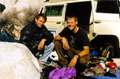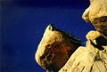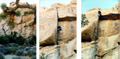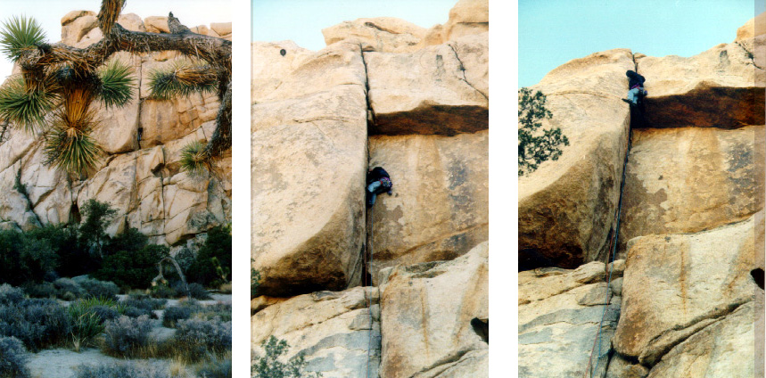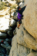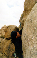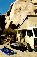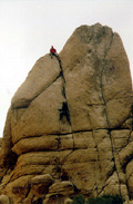 The night was really cold and very windy, so it is hard to get out of our warm sleeping bags. Eventually we manage to put the kettle on, and a strong cup of coffee enables us to face the cold new day. We are camped in Hidden Valley campground, not a bad place to be for Joshua Tree rock action. Plenty of great looking routes within spitting distance. We rack up with the new ropes we bought in San Diego, and with a slightly heavier rack due to the new camalot 4 and other bits of hardware we couldn't resist bying yesterday. We have a "selected climbs" guide book and decide to sample some of the action on the South face of Intersection rock, a big chunck of rock just south of the camp ground. |