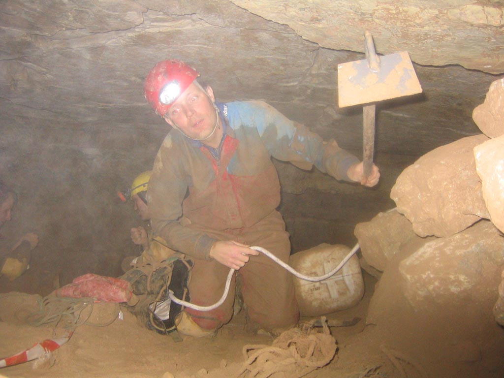 Digging the sand out was the easy part. The harder part is getting the sand in the tray ready to be dragged back. It seems to take an eternity to fill the tray by hand. Given that our technique here might be somewhat lacking, we will in future overcome this problem with a mini-shovel (from the cavedigging aisle of B&Q Warehouse). I didn't know what was going on behind me, but when I shouted "take in", the tray disappeared with a pristine rope behind me, to appear empty moments later with a now skanky, sandy excuse for a rope. It was clear to me that the team behind the front line were developing an efficient system behind. Progress forwards was fairly easy with a sweeping action of the hoe across the dig face, with an occasional use of the crowbar to persuade the odd boulder out of the way. It is a fine line between making a headlong lunge forwards in the dig and doing the decent thing by widening and deepening the dig: I think I erred on the side of the lunge!